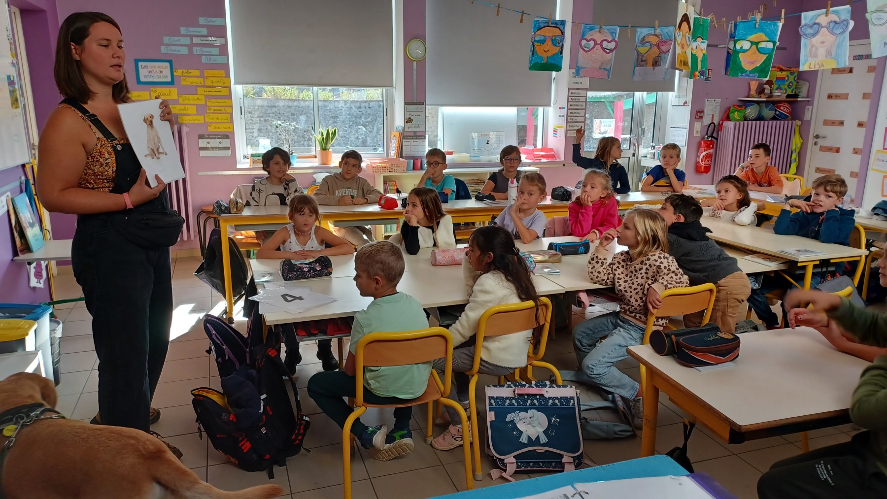 La semaine dernière, les élèves de CP, CE1 et CE2 ont eu la chance d’accueillir Fanny Métayer, comportementaliste canine, ainsi que ses deux très sympathiques compères Pitch et Lucky dans les classes.