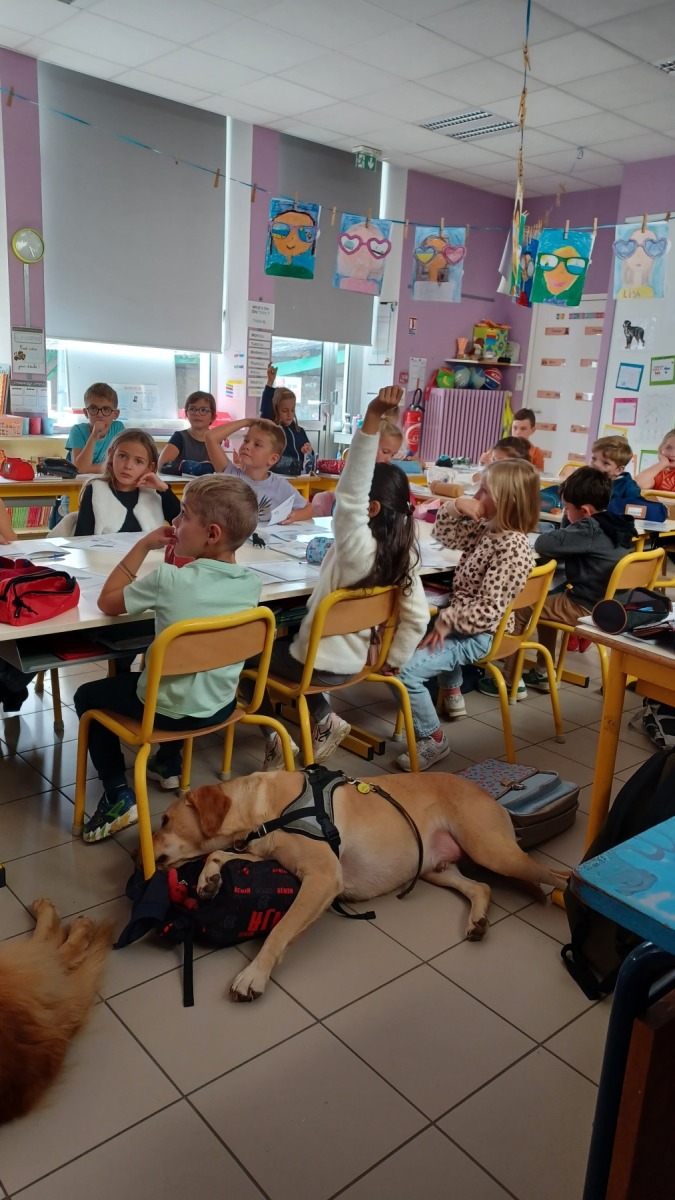 La semaine dernière, les élèves de CP, CE1 et CE2 ont eu la chance d’accueillir Fanny Métayer, comportementaliste canine, ainsi que ses deux très sympathiques compères Pitch et Lucky dans les classes.