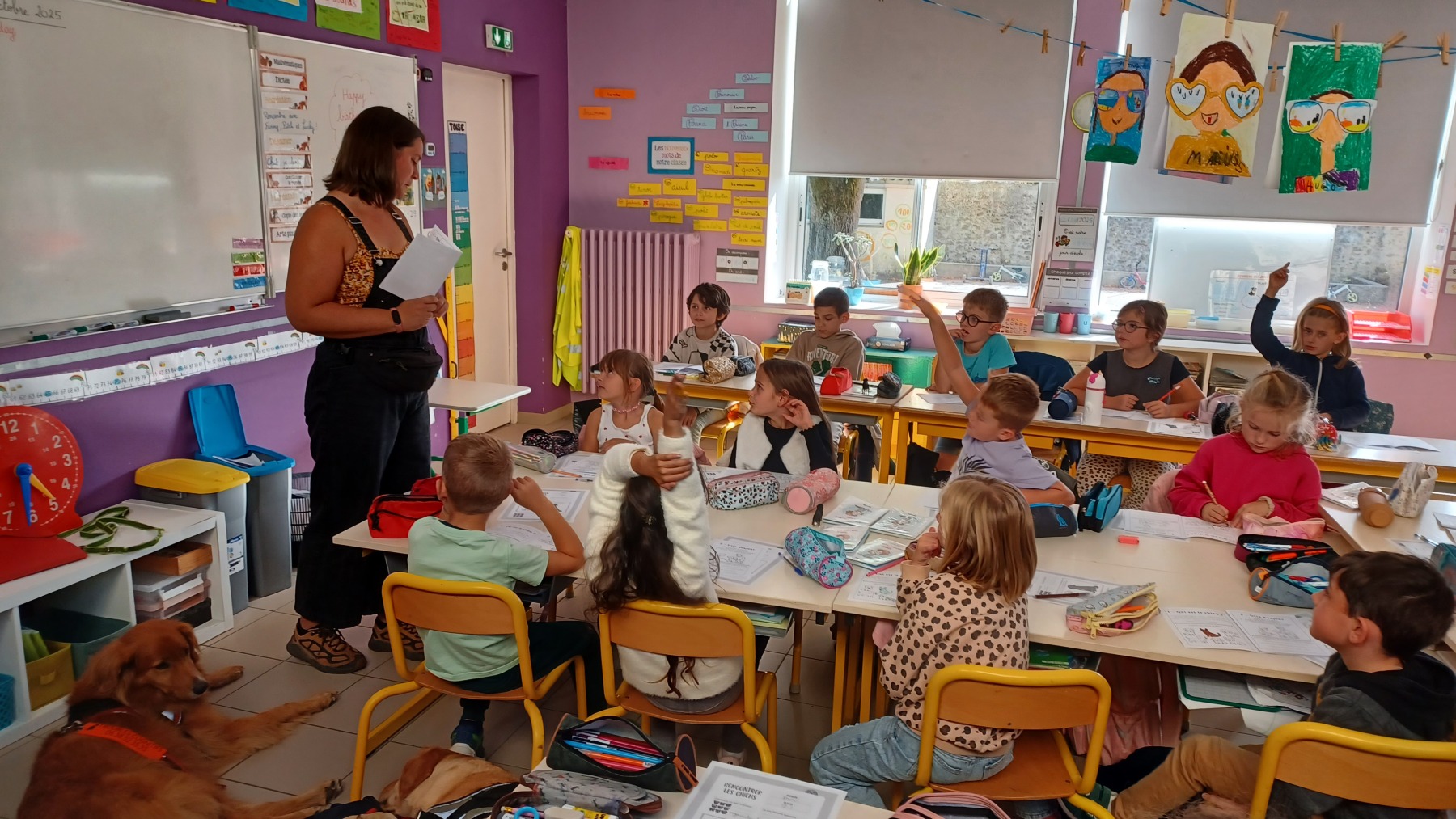 La semaine dernière, les élèves de CP, CE1 et CE2 ont eu la chance d’accueillir Fanny Métayer, comportementaliste canine, ainsi que ses deux très sympathiques compères Pitch et Lucky dans les classes.