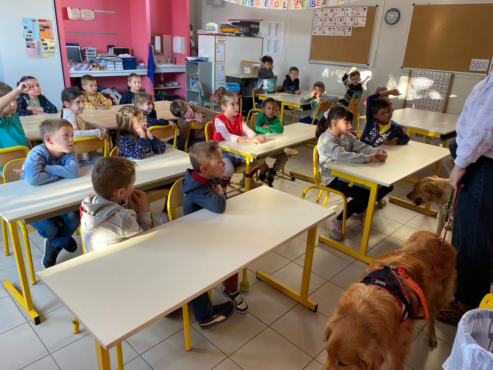 La semaine dernière, les élèves de CP, CE1 et CE2 ont eu la chance d’accueillir Fanny Métayer, comportementaliste canine, ainsi que ses deux très sympathiques compères Pitch et Lucky dans les classes.